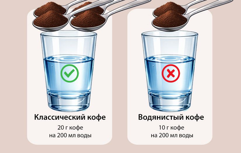 Классическое соотношение — 10 г зерна (примерно две чайные ложки с горкой) на 100 мл воды. Главное — соблюдать эту пропорцию. Если воды будет больше, напиток получится «пустым», а если меньше — слишком концентрированным и горьким.