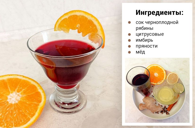 Смешайте в кастрюле сок черноплодной рябины, кружочки цитрусовых, имбирь и пряности. Нагрейте на медленном огне до 70–80 °C. Снимите с плиты, накройте крышкой и настаивайте 10–15 минут. Процедите, разлейте по бокалам. Украсьте долькой апельсина и палочкой корицы.