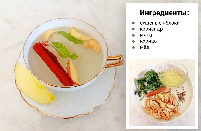 Горсть сушеных яблок залейте холодной водой, доведите до кипения и варите на медленном огне 15 минут. Зерна кориандра слегка раздавите ножом, чтобы они лучше раскрыли аромат. Добавьте корицу, мяту и потомите еще две-три минуты. Настаивайте под крышкой 20 минут. Подавайте напиток горячим или теплым. Для более насыщенного вкуса можно добавить горсть изюма.