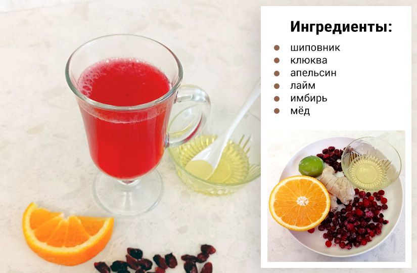 Две столовые ложки шиповника измельчите в ступке или кофемолке. Пересыпьте в термос, залейте литром горячей воды и настаивайте два-три часа. Горсть клюквы разомните в чашке с ложкой меда, добавьте мякоть половины апельсина, сок лайма и небольшой кусочек свежего имбиря. Залейте настоем шиповника. Процедите и подавайте с апельсиновой долькой.