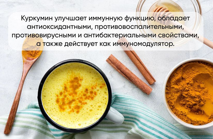 Доказано, что куркумин улучшает иммунную функцию, обладает антиоксидантными, противовоспалительными, противовирусными и антибактериальными свойствами, а также действует как иммуномодулятор.