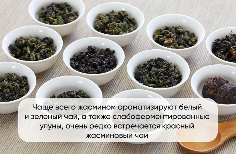 Чаще всего жасмином ароматизируют белый и зеленый чай, а также слабоферментированные улуны, очень редко встречается красный жасминовый чай (к примеру, Моли Хуа Шайцин Хун Ча) или еще реже – шен пуэр.